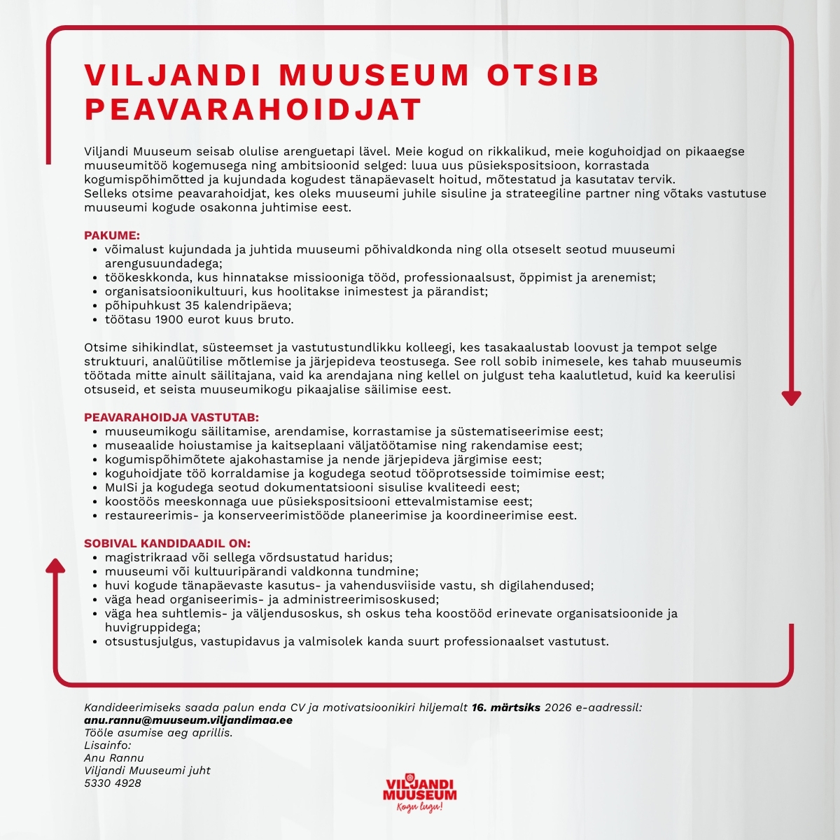 Kandideerimiseks saada palun enda CV ja motivatsioonikiri hiljemalt 16. märtsiks 2026 e-aadressil: anu.rannu@muuseum.viljandimaa.ee